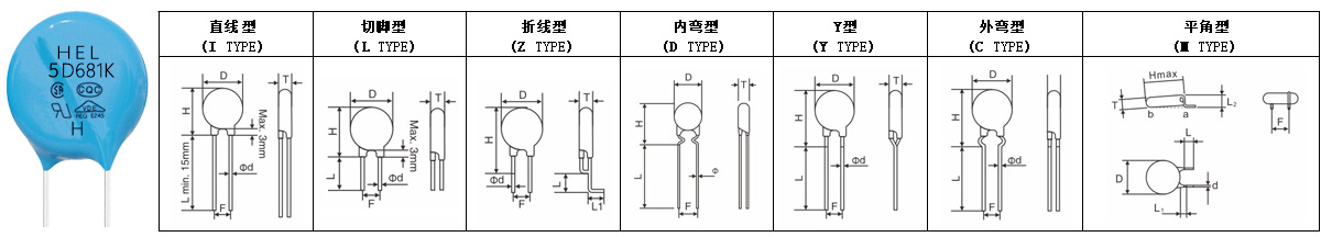 | 型號(hào)規(guī)格 | 壓敏電壓 | 最大允許使用電壓 | 最大限制電壓 | 通流容量 | 電極種類(lèi) | 包裝方式 | 產(chǎn)品外形 | 是否 切短腳 |